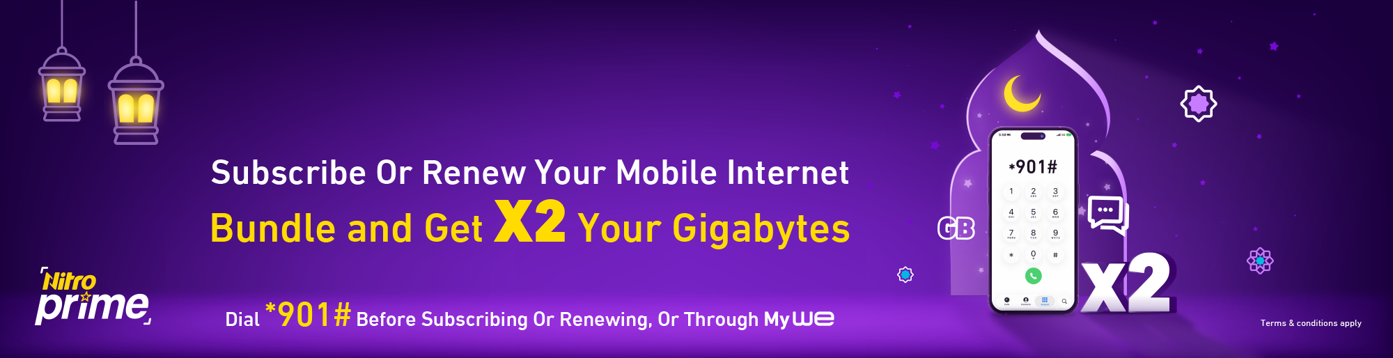 • For all Nitro Prime customers, you can enjoy the promotional megabytes by subscribing or renewing your Nitro Prime bundle through *901#, My WE App, by calling the customer service number (111), or by visiting the nearest branch.